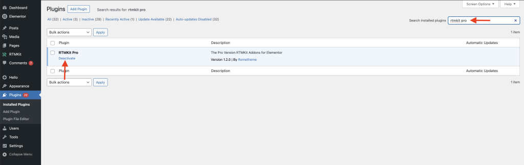 • Click PluginsInstalled Plugins → Search RTMKit Pro → Click Deactivate
