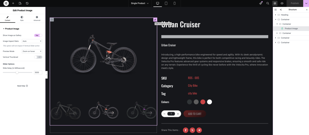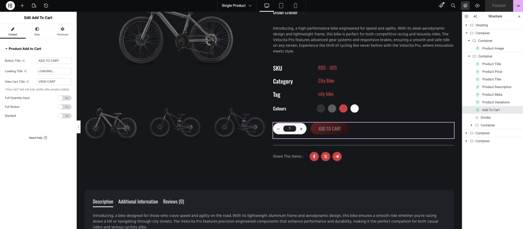 • Inside the editor, you’ll find various widgets that you can use to design your Single Product layout and make it look more professional and engaging.