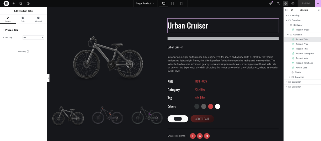 This widget displays your product name. You can easily adjust the typography, color, spacing, and other style settings.