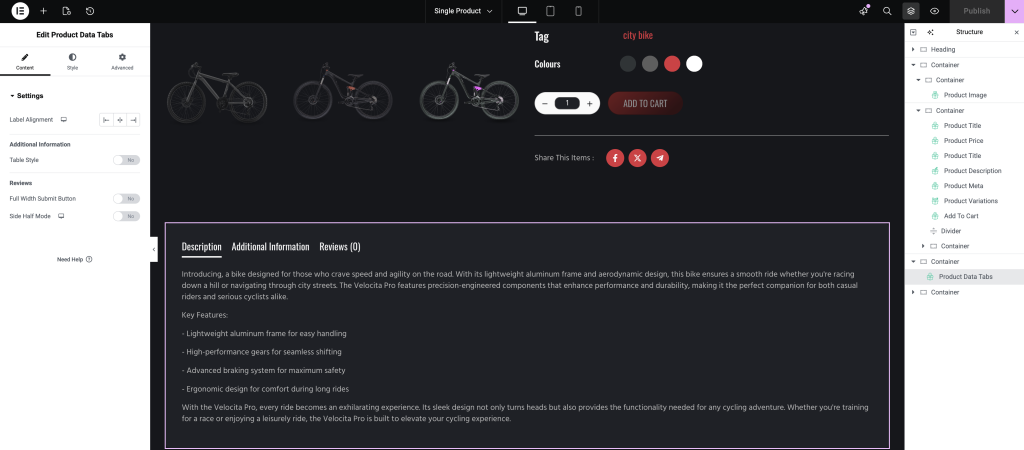 This widget displays product details such as Description, Additional Information, and Reviews. You can customize the content and styling of each tab individually.
