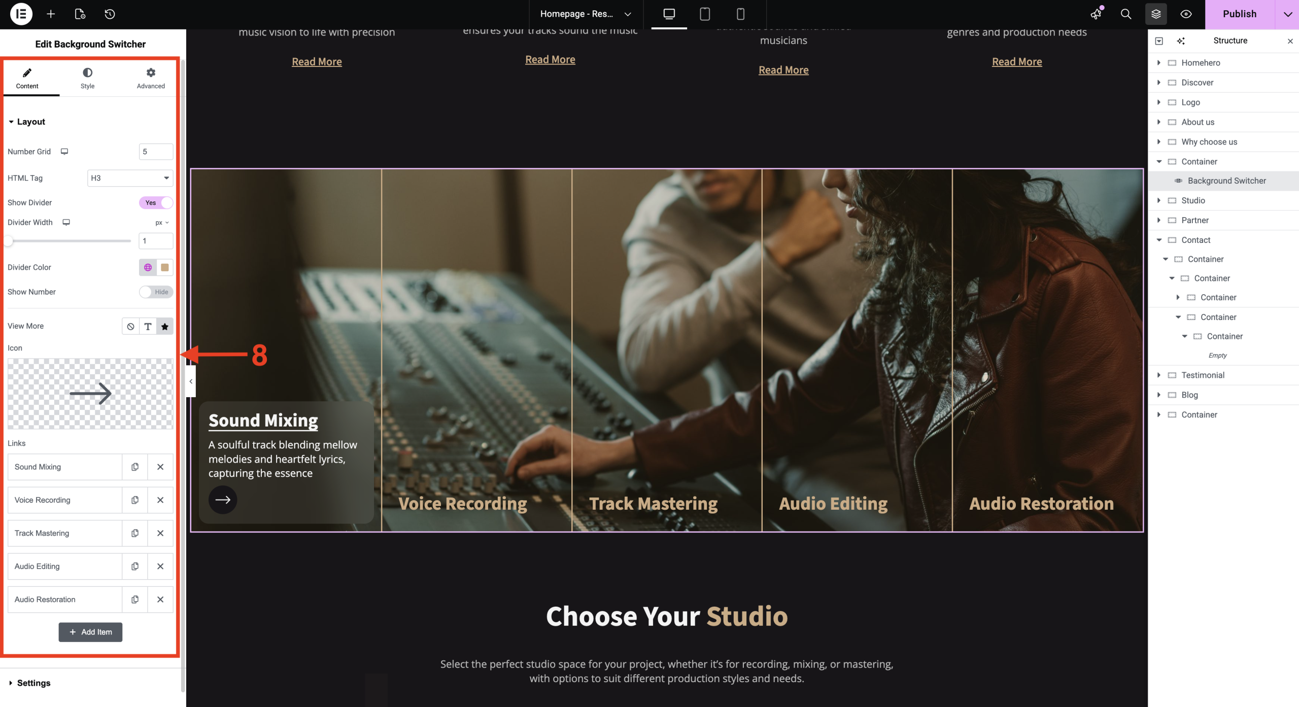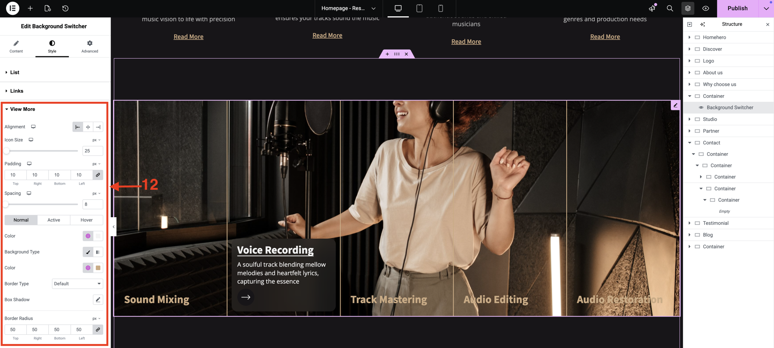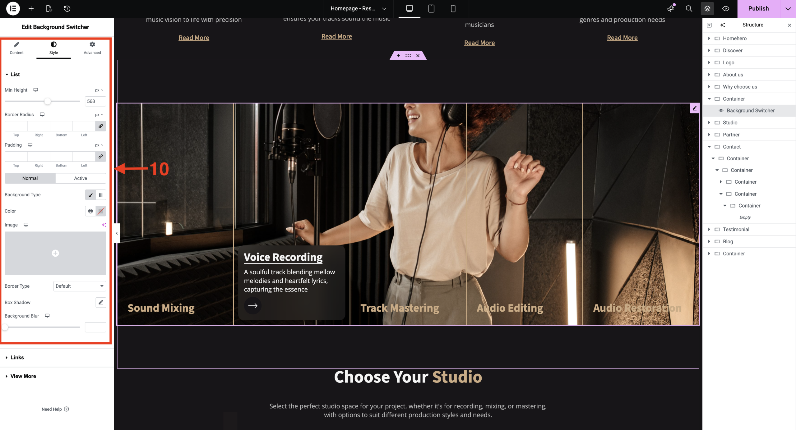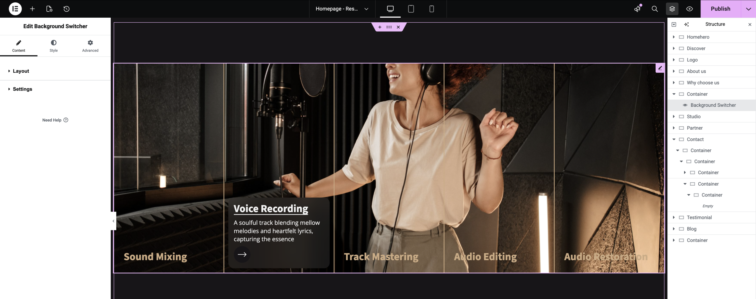 Switch your background effortlessly using the background switcher, and customize it to match your design style, whether you prefer a solid color, gradient, or image background.