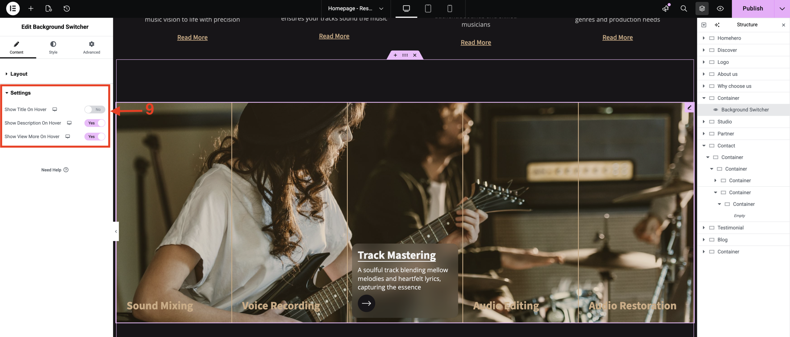 • Enable Show Title, Description, and View More on Hover to make your content more interactive.