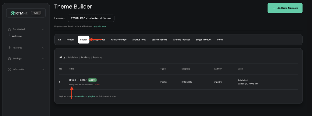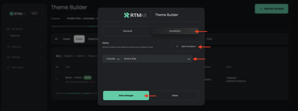 • Then, go to the Condition TabAdd Condition → select Entire Site (if you want this footer to appear on all pages).
