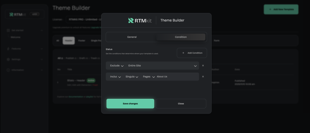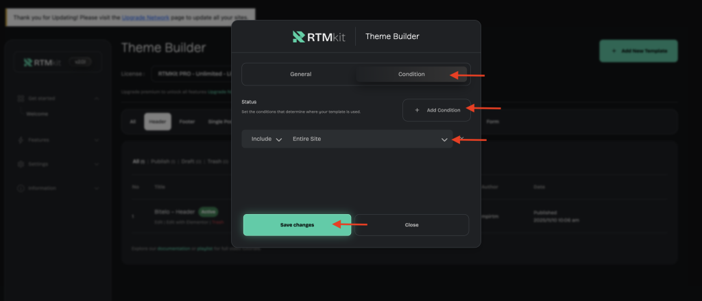 • Then, go to the Condition TabAdd Condition → select Entire Site (if you want this header to appear on all pages).