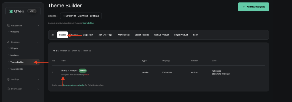 • Once completed, go to Theme Builder and click Header.
