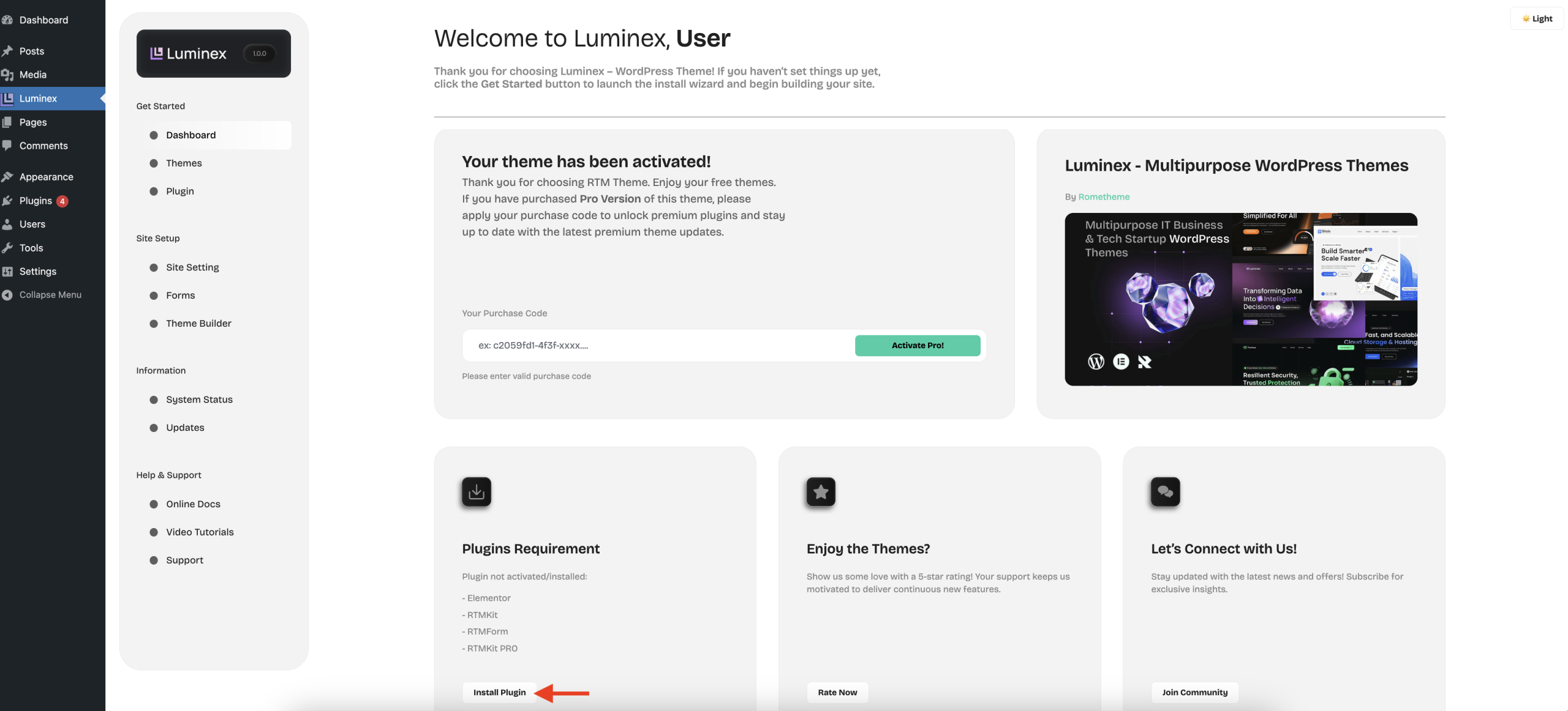• Ensure that you install and activate the following required plugins: Elementor, RTMKit, RTMForm, and RTMKit Pro.
