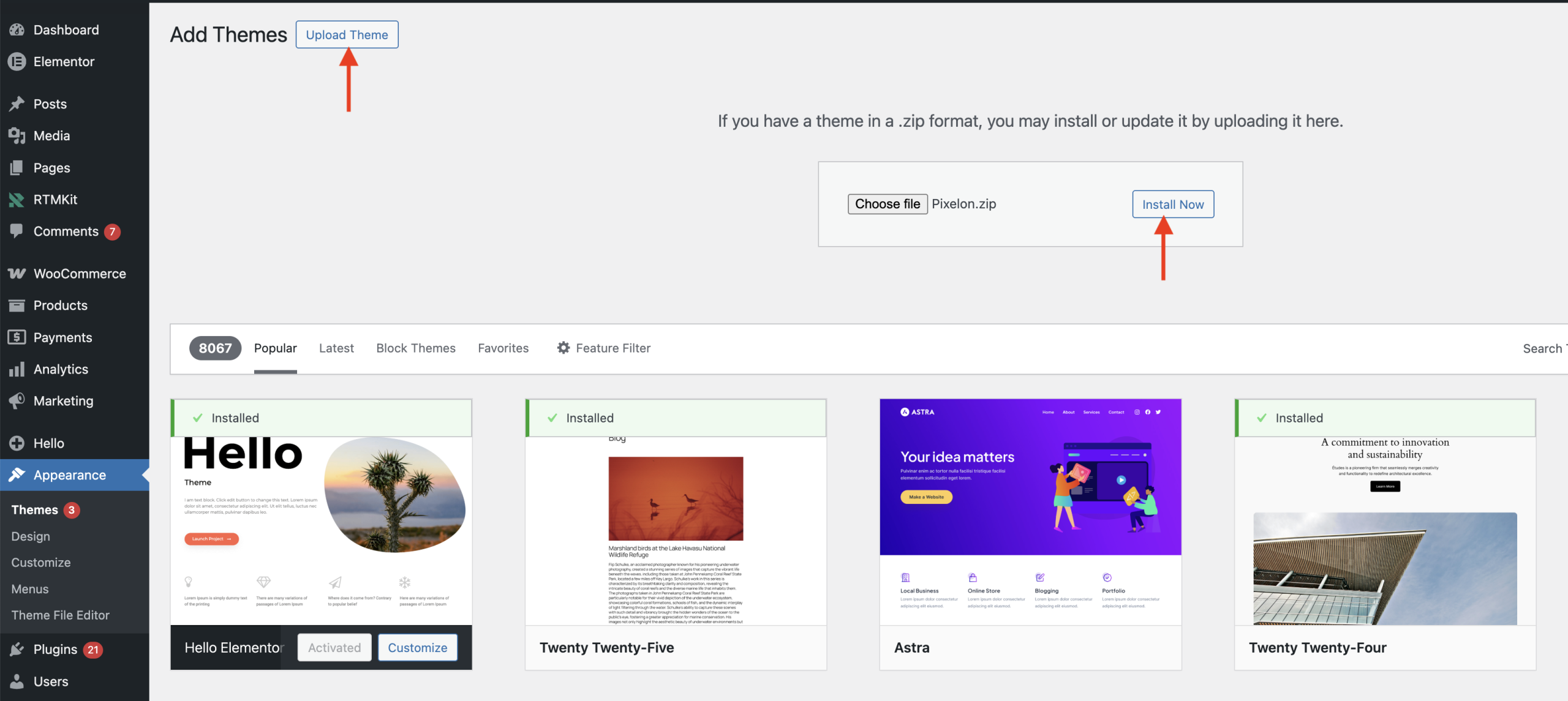 - Located at the top of the screen, click on the Add Theme button. Then, click on Upload Theme